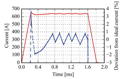 Measured current pulse (solid red: magnetcurrent, dashed blue: deviation from ideal current) [wepma002.pdf], validation of pulse specifications.