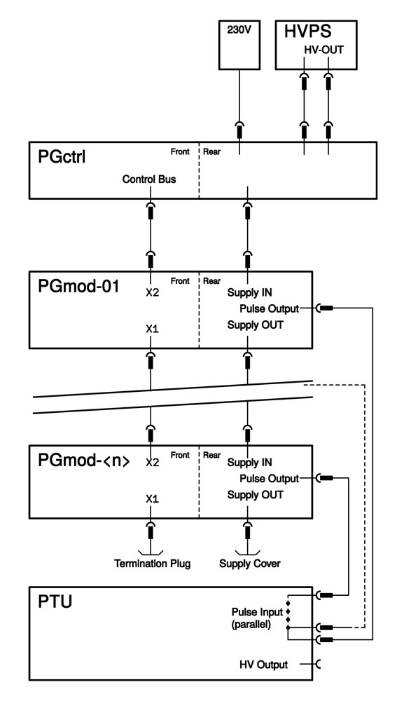 To operate the PG modular system, a high voltage power supply (HVPS) is required. Optionally, e.g. for load matching, a pulse transformer unit (PTU) can be connected.